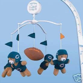 Chicago Bears baby crib mobile - This adorable musical mobile features the tune "Football Lullabye" with team plushes hanging from it. Start a little one's team spirit off early with sight and sound. Easy assembly and adjusting. Licensed by the National Football League. Meets or exceeds government regulations, including the Toy Safety Standard ASTM F963. A perfect item for the Bears fan and makes a great baby shower gift.